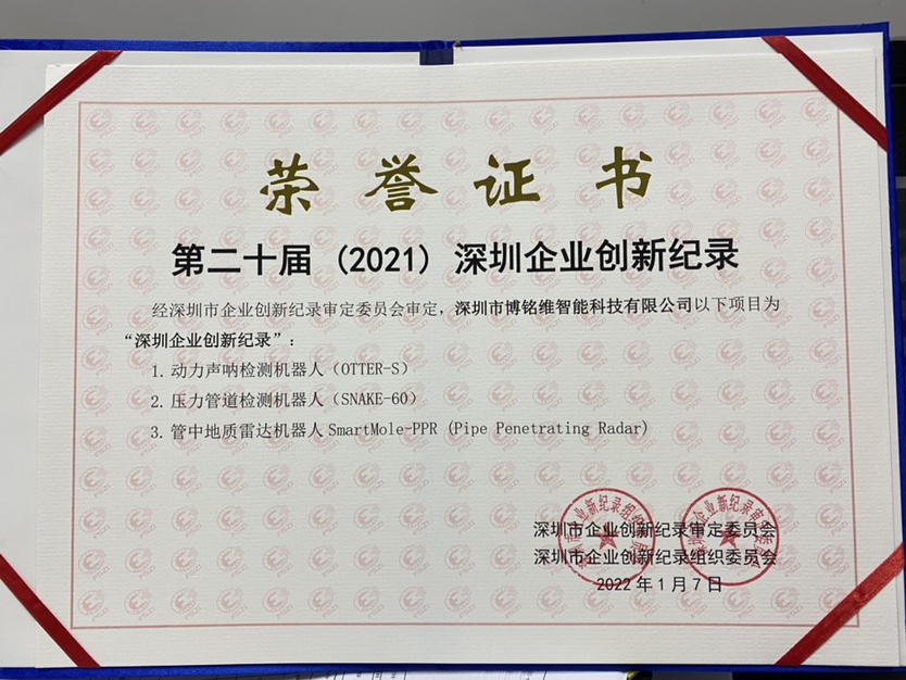 我们在中国推出首款采用无线通信技术的高清潜望镜(Peek系列管道无线 潜望镜)。 我们在中国推出首款模块化、轻量化的管网检测机器人(Dolphin系列机器 人)。 我们被认定为高新技术企业。