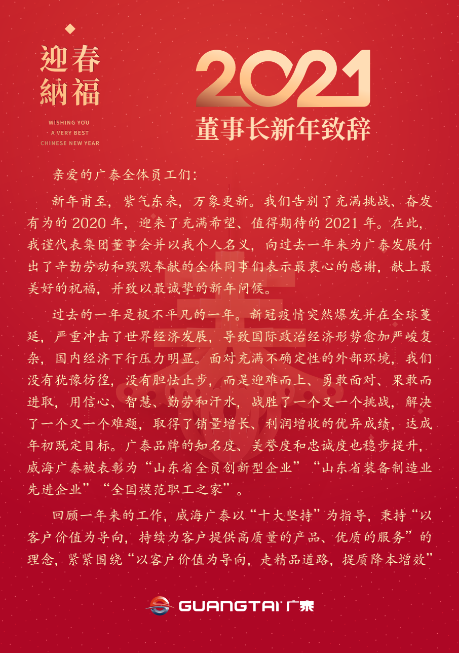 “感动”与“最美”触动心灵;“目标”和“嘱托”催人奋进。回首2020,新冠疫情突然爆发并在全球蔓延,广泰集团科学防控疫情,严密组织复工复产,以“十大坚持”为纲,以技术创新为龙头,以客户价值为导向,走精品道路,提质降本增效,打造智能化高端保障装备制造平台,实现集团高质…